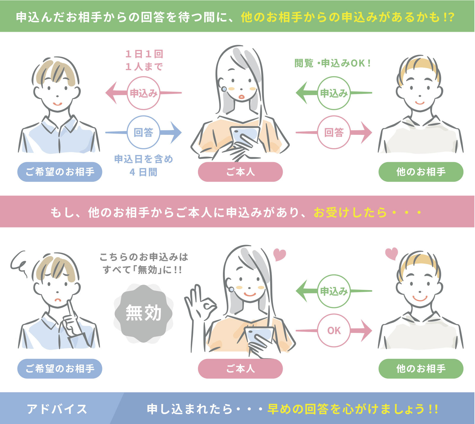 ※ほかのお相手からの申し込みをお受けした場合、ご自身のお申し込みはすべて「無効」となります。