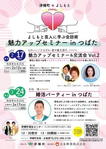 津幡町と吉本興業(株)との連携事業として、魅力アップセミナー&交流会を開催。特別ゲストと司会のぶんぶんボウルが、セミナー形式で今日から婚活に役立つ会話術やメイクアップスキルを伝授します。