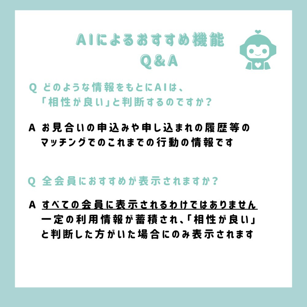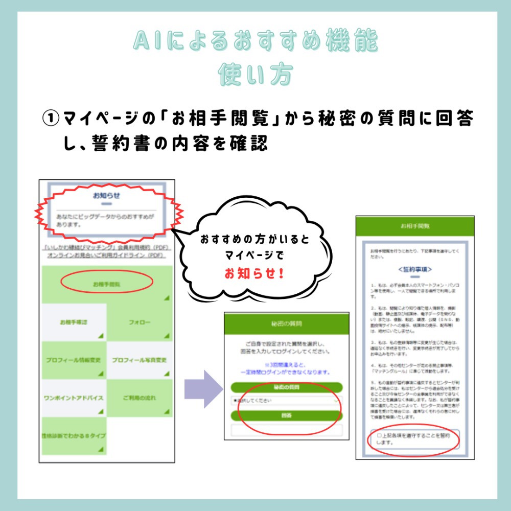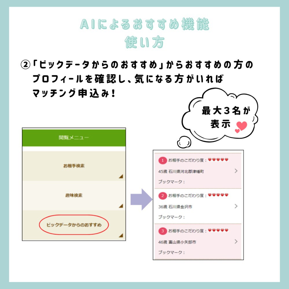 いしかわ縁結びマッチングでは、このたびAIを活用した「おすすめのお相手紹介」機能がスタートしました。お見合いの申込み・申込まれ履歴など、一定の利用情報が蓄積された会員のマイページには、AIが相性が良いと判断したお相手がおすすめとして表示されるようになります。