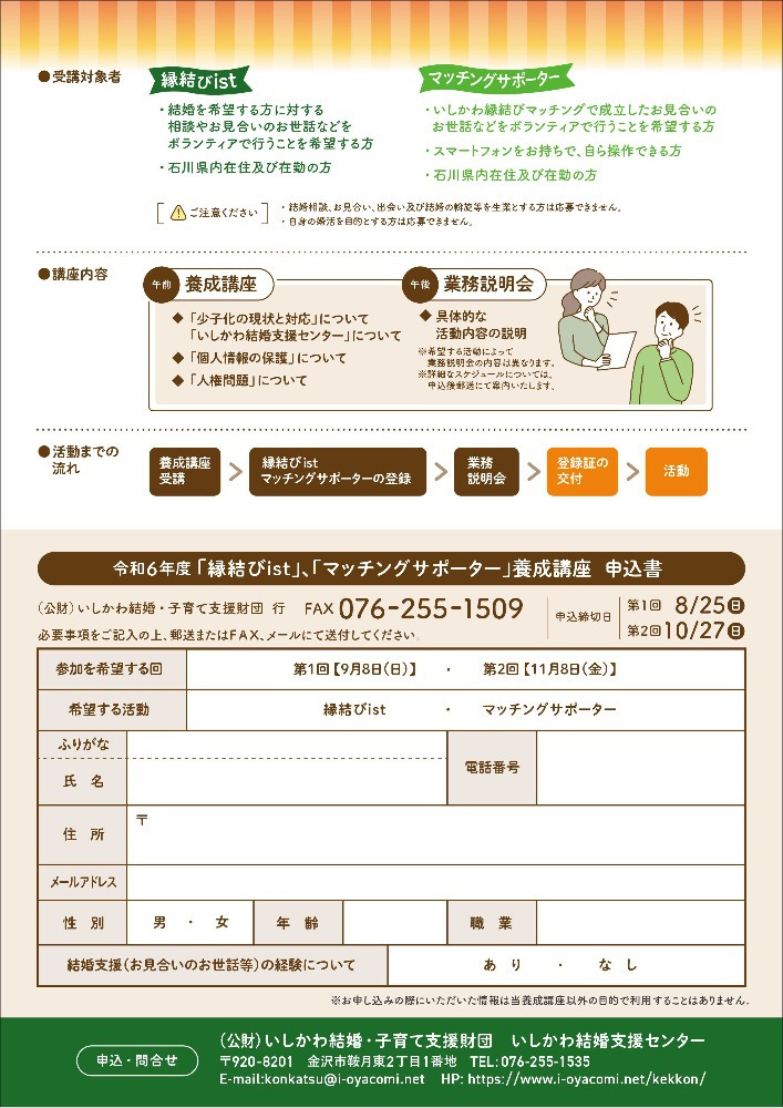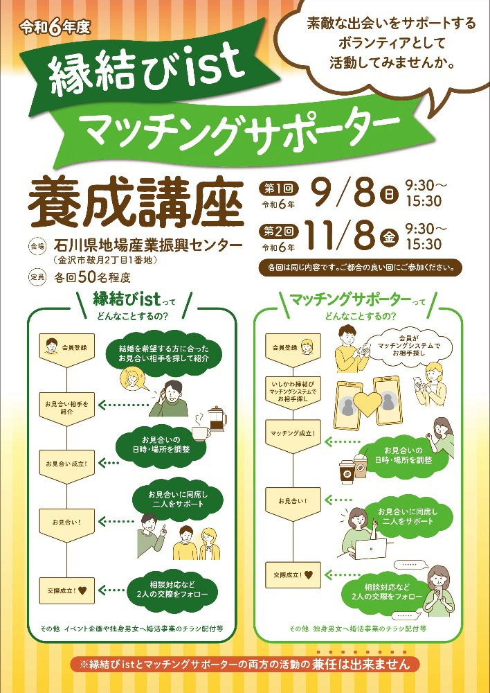 結婚を希望する独身男女の結婚相談や、お見合いのお世話などをボランティアで行っていただく「縁結びist」及び「いしかわ縁結びマッチング」システムで成立したお見合いのお世話などをボランティアで行っていただく「マッチングサポーター」の取組を行っております。