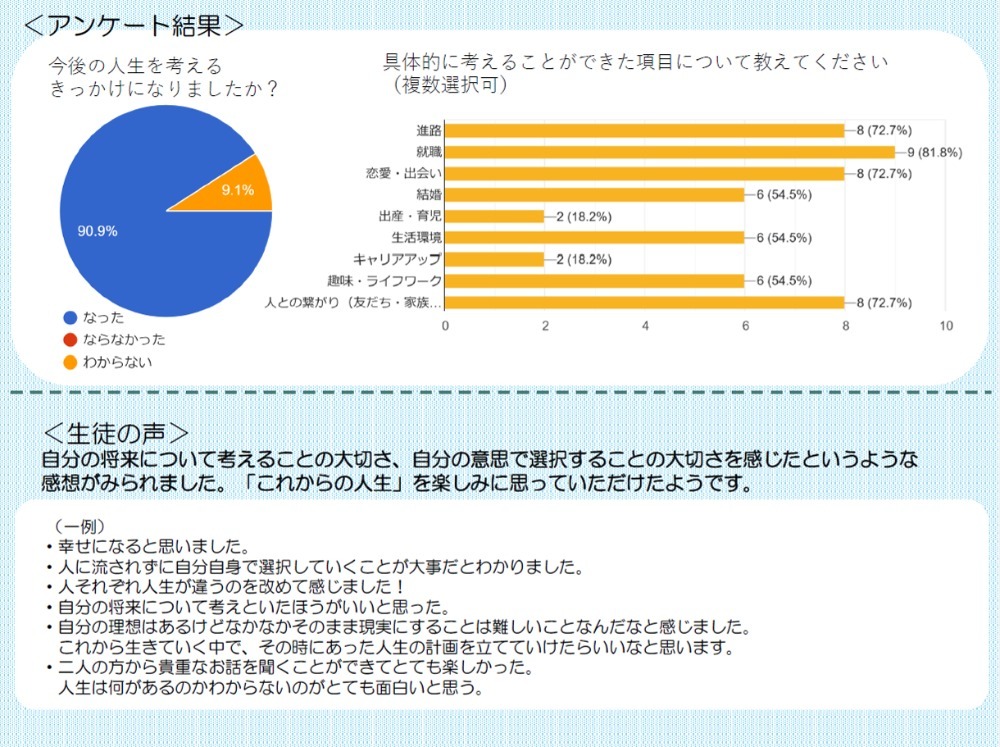 社会人の先輩に質問をしながら、人生における様々な場面での「選択」について聞けたことで、これからの人生を楽しみに思っていただく機会となったようです。